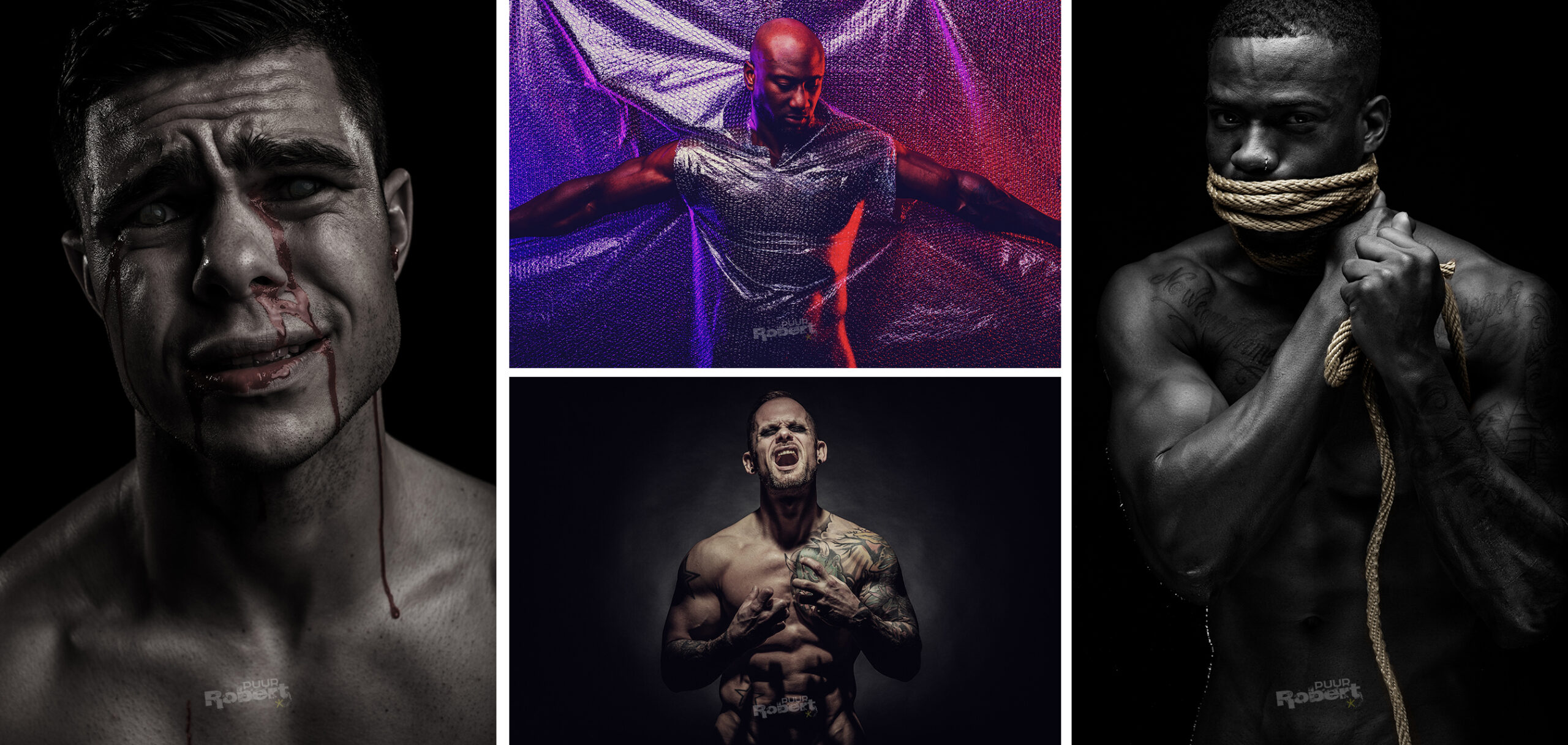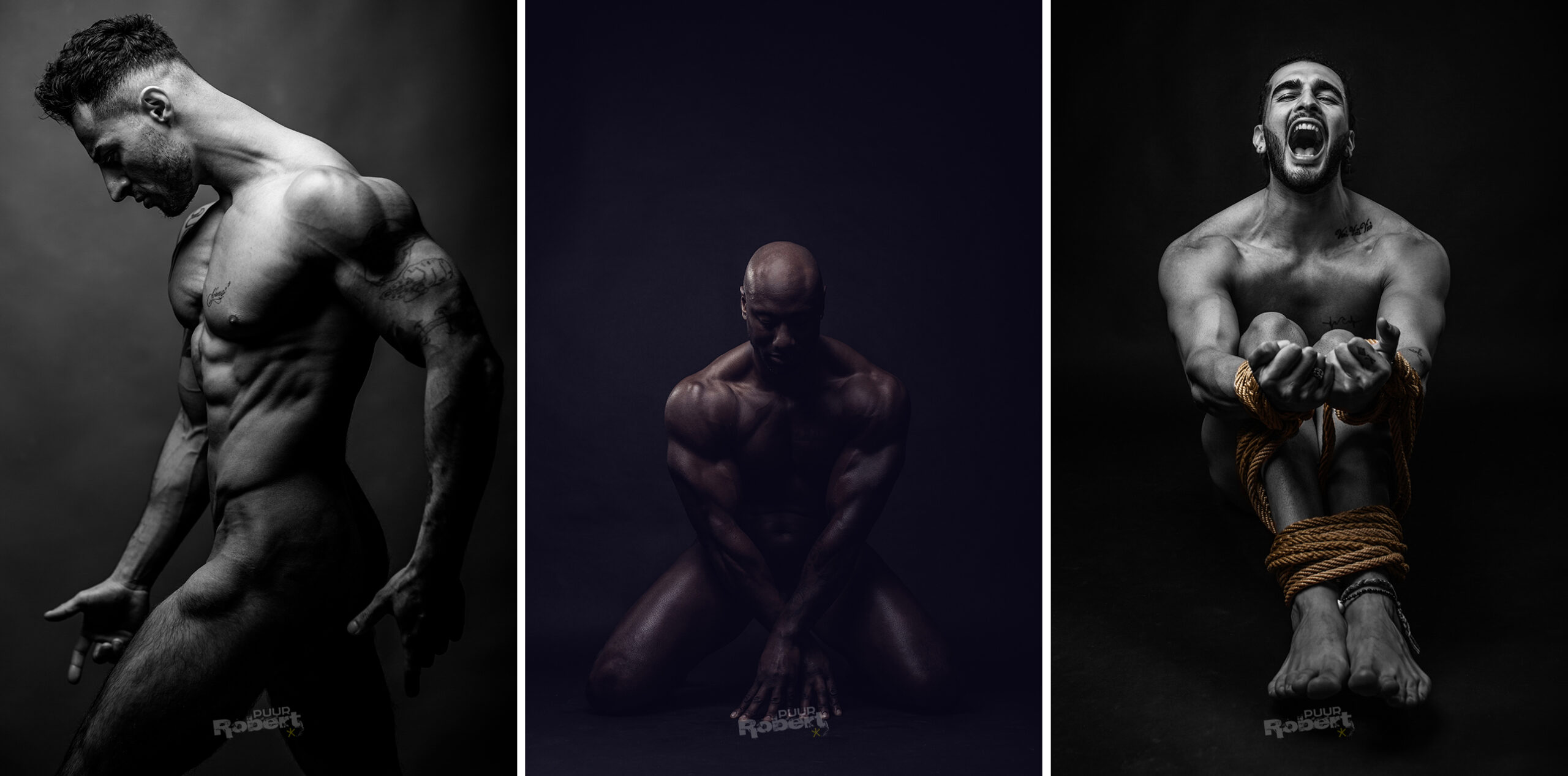 Hoewel deze twee kenmerken niet persé aan elkaar vast zitten werk ik doorgaans met modellen die fit en goed getraind zijn en daardoor juist een goede spierdefinitie bezitten. Naast een waardering voor de discipline om je lichaam zo goed in conditie te hebben vind ik dat het in de beelden mooier werkt wanneer lichaamslijnen goed zichtbaar zijn. Dit geeft kracht aan de poses in de foto’s. Dat is ook één van de redenen dat ik meestal vraag aan de modellen waar ik mee werk om naakt te durven poseren.